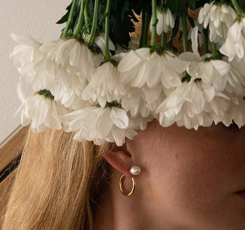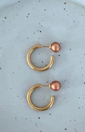 Øreringen er en kombination af ørestikken ‘Chunky Hoop’ i farven ‘Guld’ med et børstet finish og låsen ‘Pearl’ I ‘Amber’ med en guldfarvet fatning.